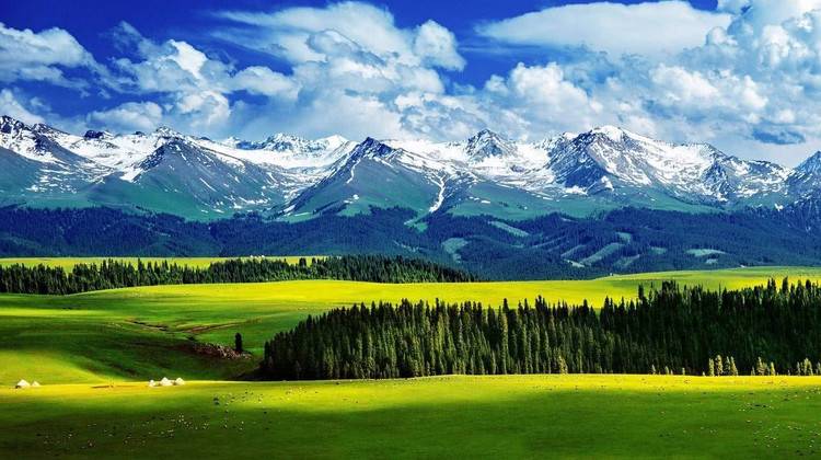那拉提空中草原是新疆新源县那拉提旅游风景区的组成部分之一,从远处看,一半是草原一半是雪山。在蓝天白云下,雪山,赛马场,草原,山丘,溪流相互交融,宛如一幅美丽的风景画。