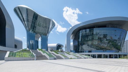 乌鲁木齐文化中心位于水磨沟区会展中心片区,占地约19.57万平方米,建筑面积达25.65万平方米,以天山“雪莲”为设计灵感,由大剧院、音乐厅、博物馆、规划馆、展览馆、文化馆六大场馆环绕中心文化塔组成,象征民族团结与繁荣,被誉为“六馆一心”。
