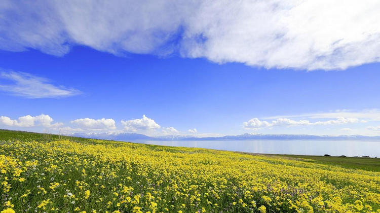 西海草原位于湖西侧的山间盆地,属草甸草原。在这里,空气中溢着花的芳香、漫着草的清新,蓝天与碧水一色、草原和雪山辉映。