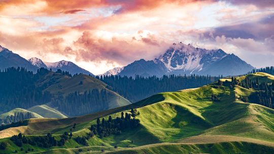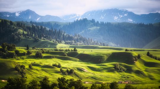 那拉提空中草原是新疆新源县那拉提旅游风景区的组成部分之一,从远处看,一半是草原一半是雪山。在蓝天白云下,雪山,赛马场,草原,山丘,溪流相互交融,宛如一幅美丽的风景画。