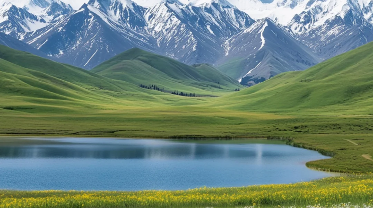 西海草原位于湖西侧的山间盆地,属草甸草原。在这里,空气中溢着花的芳香、漫着草的清新,蓝天与碧水一色、草原和雪山辉映。