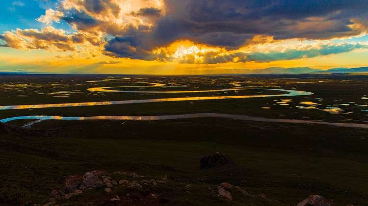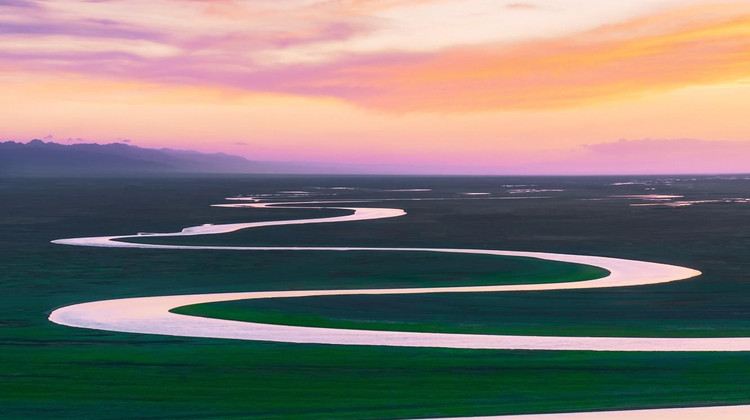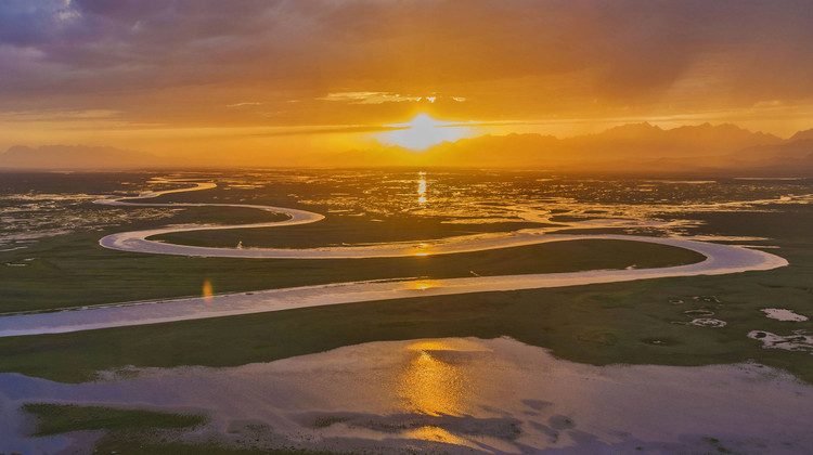 巴西里克观景台,位于一座小丘陵上,需要走一段木制栈道上去。到达观景台后,脚下就是九曲十八弯的盛景,一条彩带般的开都河在开阔的草原上逶迤蜿蜒,景色十分优美。尤其是日落时天地一片暖红,河水上反射出红色的光芒,更是无比美丽。因而这里也成了摄影家们在巴音布鲁克钟爱的摄影胜地。