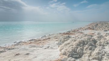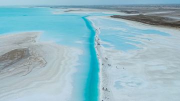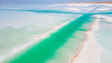 沿着通道走到湖边,就可以看到洁白纯净的茶卡盐湖,尽情游玩。湖中间有一条铁路延伸至湖内,起点处便是乘坐小火车的地方,可以乘车前往湖内深处,那里的景色更为纯净。