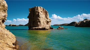 广场走到湖边处,可以看到蔚蓝浩瀚的青海湖就在眼前,沿湖修建了木制栈道,栈道东侧有福娃、西王母的雕像,湖中是一座鱼雷基地的遗址,这里曾是建国后151鱼雷基地的所在地,所以青海湖二郎剑景区也被称为151景区。