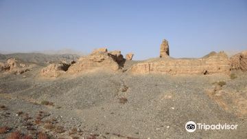 沙漠有两座红白分明的高大沙丘,名为“圣墓山”,它是分别由红沙岩和白石膏组成。圣墓山上的风蚀蘑菇,奇特状观,高约5米,巨大的盖下可容纳10余人。