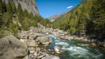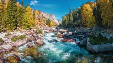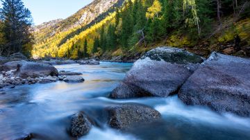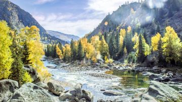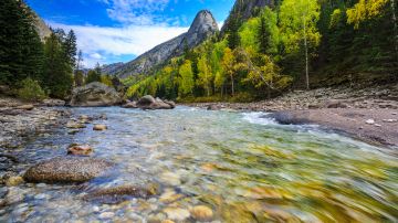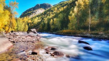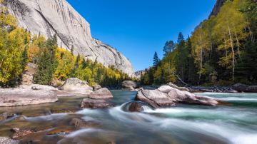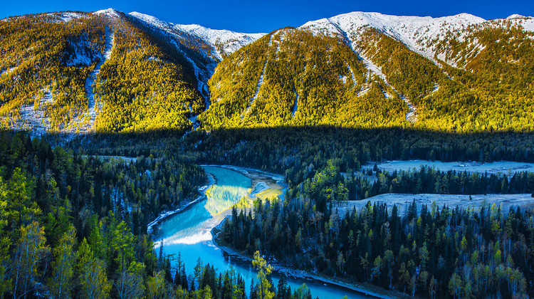 可可托海位于北疆阿勒泰地区的富蕴县东北侧,是一般游客游玩北疆喀纳斯环线路上会前往的重要景点。景区里有幽深的峡谷、清澈透明的河流、陡峭秀丽的山峰,环境非常优美。在峡谷之间还有大面积的桦树、杨树和松树林,适合秋天前来,此时树叶金黄绚烂,而森林背后的山顶此时也开始积雪好像漂亮的雪山,山林河水相映,是秋色摄影的不错之选。
