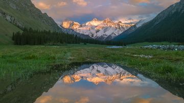 “孟克特”是蒙语,意为“永不融化的雪峰”,因终年不化的积雪而得名。孟克特古道的起点位于独库公路625公里的道路附近,终点则是"百里画廊"唐布拉国家森林公园,省道315的别勒布拉克村附近的岔口处,古道长度约为70公里。从起点徒步行程20km到乌兰萨德克湖,蒙古语意为“红色的弓箭湖”,海拔约2320米,高山俯瞰着湖水,湖水倒映着高山,湖间已经死去的胡杨,依然挺拔的不可思议,那穿透生死界限的磅礴生命力,是无声的震撼,被徒步爱好者誉为(天湖)。此条古道千百年来淹没于美丽的天山之中鲜有人涉足,被网上誉为新疆十大徒步线路之一。而位于该景区26公里处的孟克特湖,则与天湖遥相呼应,湖水翠绿、形如桃心,像静卧于山间与天相连,被当地人称之为“小天湖”。