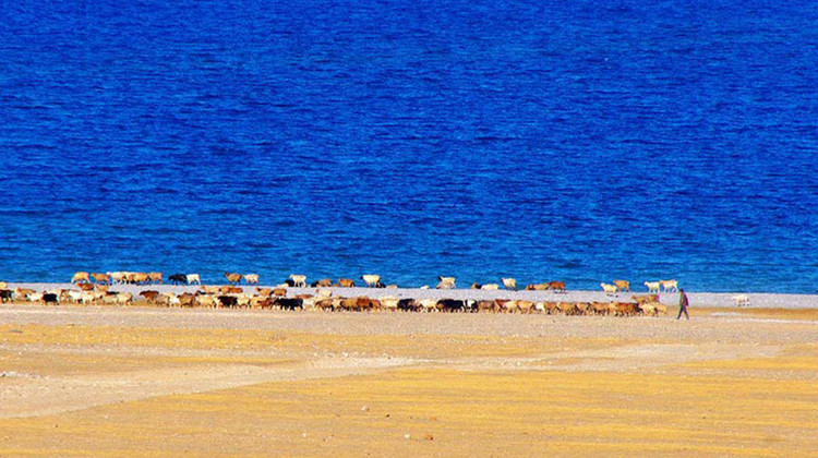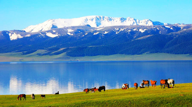 西海草原位于湖西侧的山间盆地,属草甸草原。在这里,空气中溢着花的芳香、漫着草的清新,蓝天与碧水一色、草原和雪山辉映。