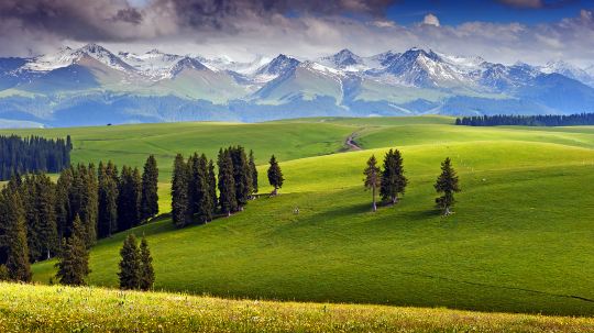 那拉提空中草原是新疆新源县那拉提旅游风景区的组成部分之一,从远处看,一半是草原一半是雪山。在蓝天白云下,雪山,赛马场,草原,山丘,溪流相互交融,宛如一幅美丽的风景画。