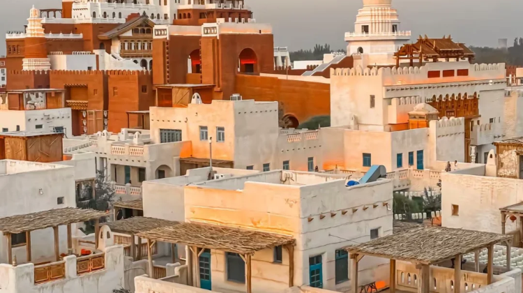 喀什古城:极具规模的生土建筑群,融合了汉唐、古罗马遗风和维吾尔民族现代生活的特点。城内街巷纵横交错,布局灵活多变,曲径通幽,民居大多为土木、砖木结构,不少传统民居已有上百年的历史,是以伊斯兰文化为特色的迷宫式城市街区。
